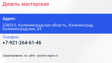 Дизель, мастерская по адресу 238313, Калининградская область, Калининград, Калининградская, 24 в дальнейшем Организация, размещена в следующих категориях: