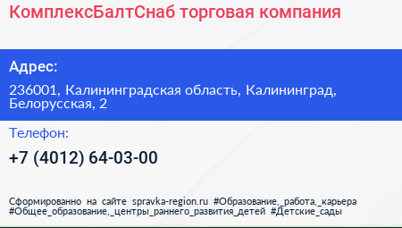 КомплексБалтСнаб, торговая компания по адресу 236001, Калининградская область, Калининград, Белорусская, 2 в дальнейшем Организация, размещена в следующих категориях: