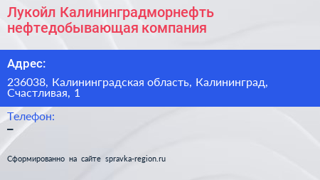 Лукойл-Калининградморнефть, нефтедобывающая компания по адресу 236038, Калининградская область, Калининград, Счастливая, 1 в дальнейшем Организация, размещена в следующих категориях: