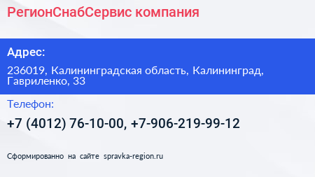 РегионСнабСервис, компания по адресу 236019, Калининградская область, Калининград, Гавриленко, 33 в дальнейшем Организация, размещена в следующих категориях: