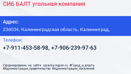 СИБ-БАЛТ, угольная компания по адресу 236034, Калининградская область, Калининград, в дальнейшем Организация, размещена в следующих категориях: