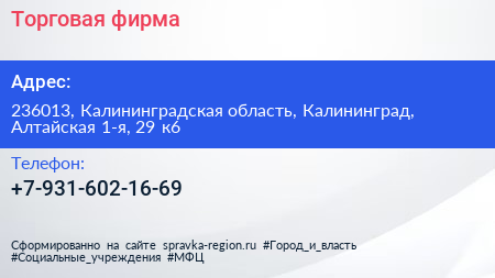 Торговая фирма по адресу 236013, Калининградская область, Калининград, Алтайская 1-я, 29 к6 в дальнейшем Организация, размещена в следующих категориях: