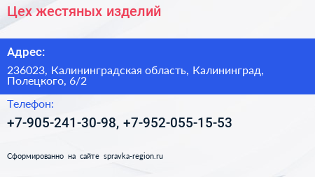 Цех жестяных изделий по адресу 236023, Калининградская область, Калининград, Полецкого, 6/2 в дальнейшем Организация, размещена в следующих категориях: