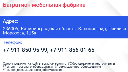 Багратион, мебельная фабрика по адресу 236005, Калининградская область, Калининград, Павлика Морозова, 115а в дальнейшем Организация, размещена в следующих категориях: