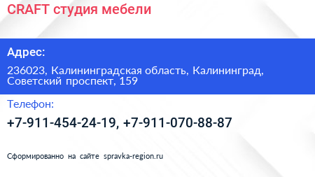 CRAFT, студия мебели по адресу 236023, Калининградская область, Калининград, Советский проспект, 159 в дальнейшем Организация, размещена в следующих категориях: