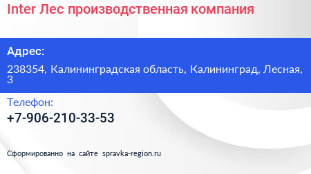 Inter-Лес, производственная компания по адресу 238354, Калининградская область, Калининград, Лесная, 3 в дальнейшем Организация, размещена в следующих категориях: