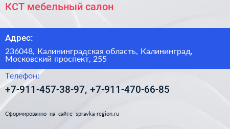 КСТ, мебельный салон по адресу 236048, Калининградская область, Калининград, Московский проспект, 255 в дальнейшем Организация, размещена в следующих категориях: