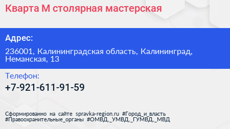Кварта-М, столярная мастерская по адресу 236001, Калининградская область, Калининград, Неманская, 13 в дальнейшем Организация, размещена в следующих категориях: