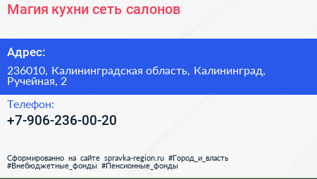 Магия кухни, сеть салонов по адресу 236010, Калининградская область, Калининград, Ручейная, 2 в дальнейшем Организация, размещена в следующих категориях: