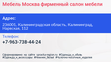 Мебель-Москва, фирменный салон мебели по адресу 236001, Калининградская область, Калининград, Нарвская, 112 в дальнейшем Организация, размещена в следующих категориях: