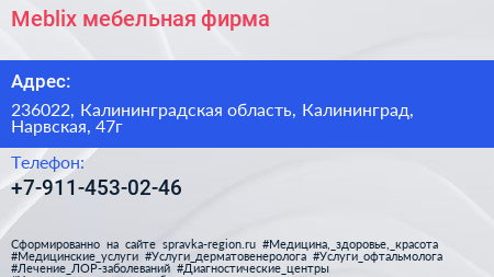 Meblix, мебельная фирма по адресу 236022, Калининградская область, Калининград, Нарвская, 47г в дальнейшем Организация, размещена в следующих категориях:
