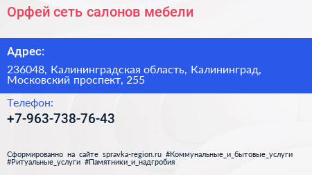 Орфей, сеть салонов мебели по адресу 236048, Калининградская область, Калининград, Московский проспект, 255 в дальнейшем Организация, размещена в следующих категориях: