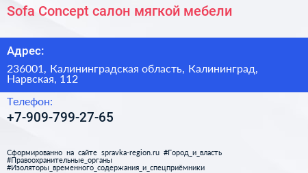 Sofa Concept, салон мягкой мебели по адресу 236001, Калининградская область, Калининград, Нарвская, 112 в дальнейшем Организация, размещена в следующих категориях:
