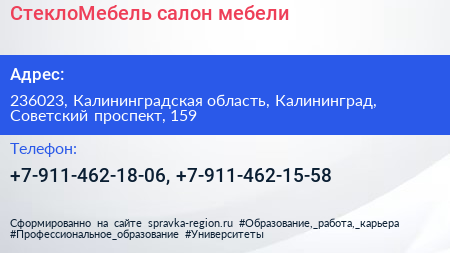 СтеклоМебель, салон мебели по адресу 236023, Калининградская область, Калининград, Советский проспект, 159 в дальнейшем Организация, размещена в следующих категориях: