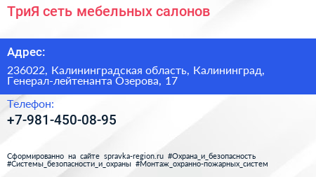 ТриЯ, сеть мебельных салонов по адресу 236022, Калининградская область, Калининград, Генерал-лейтенанта Озерова, 17 в дальнейшем Организация, размещена в следующих категориях: