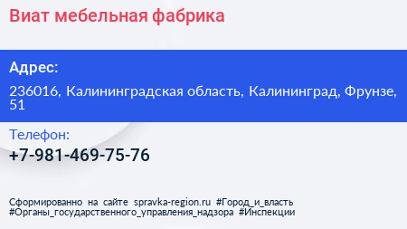 Виат, мебельная фабрика по адресу 236016, Калининградская область, Калининград, Фрунзе, 51 в дальнейшем Организация, размещена в следующих категориях: