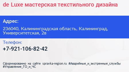 de Luxe, мастерская текстильного дизайна по адресу 236040, Калининградская область, Калининград, Университетская, 2в в дальнейшем Организация, размещена в следующих категориях: