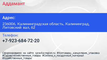 Аддамант по адресу 236006, Калининградская область, Калининград, Литовский вал, 62 в дальнейшем Организация, размещена в следующих категориях: