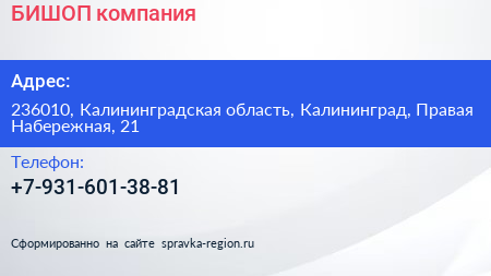 БИШОП, компания по адресу 236010, Калининградская область, Калининград, Правая Набережная, 21 в дальнейшем Организация, размещена в следующих категориях: