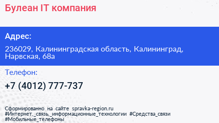 Булеан, IT-компания по адресу 236029, Калининградская область, Калининград, Нарвская, 68а в дальнейшем Организация, размещена в следующих категориях: