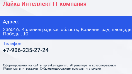 Лайка Интеллект, IT-компания по адресу 236016, Калининградская область, Калининград, площадь Победы, 10 в дальнейшем Организация, размещена в следующих категориях: