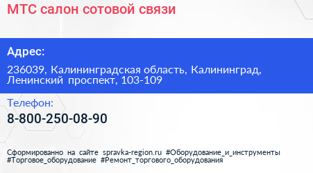 МТС, салон сотовой связи по адресу 236039, Калининградская область, Калининград, Ленинский проспект, 103-109 в дальнейшем Организация, размещена в следующих категориях: