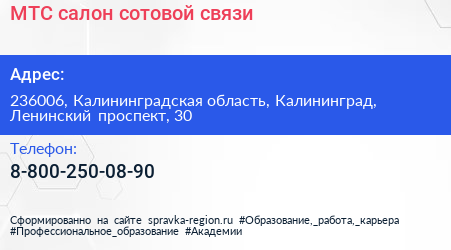 МТС, салон сотовой связи по адресу 236006, Калининградская область, Калининград, Ленинский проспект, 30 в дальнейшем Организация, размещена в следующих категориях:
