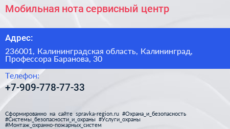 Мобильная нота, сервисный центр по адресу 236001, Калининградская область, Калининград, Профессора Баранова, 30 в дальнейшем Организация, размещена в следующих категориях: