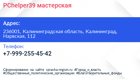 PChelper39, мастерская по адресу 236001, Калининградская область, Калининград, Нарвская, 112 в дальнейшем Организация, размещена в следующих категориях: