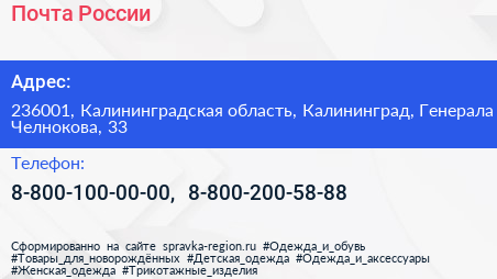 Почта России по адресу 236001, Калининградская область, Калининград, Генерала Челнокова, 33 в дальнейшем Организация, размещена в следующих категориях: