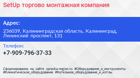 SetUp, торгово-монтажная компания по адресу 236039, Калининградская область, Калининград, Ленинский проспект, 131 в дальнейшем Организация, размещена в следующих категориях:
