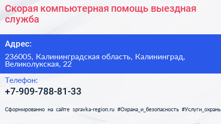 Скорая компьютерная помощь, выездная служба по адресу 236005, Калининградская область, Калининград, Великолукская, 22 в дальнейшем Организация, размещена в следующих категориях:
