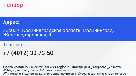 Тензор по адресу 236039, Калининградская область, Калининград, Железнодорожная, 4 в дальнейшем Организация, размещена в следующих категориях: