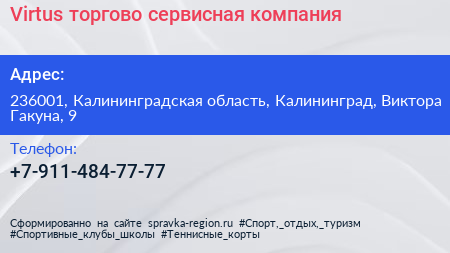 Virtus, торгово-сервисная компания по адресу 236001, Калининградская область, Калининград, Виктора Гакуна, 9 в дальнейшем Организация, размещена в следующих категориях: