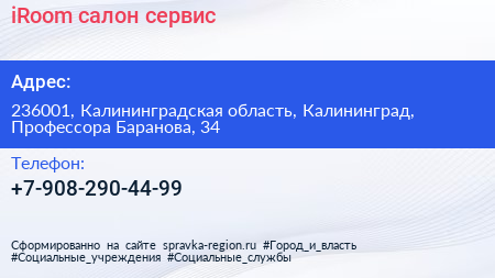 iRoom, салон-сервис по адресу 236001, Калининградская область, Калининград, Профессора Баранова, 34 в дальнейшем Организация, размещена в следующих категориях: