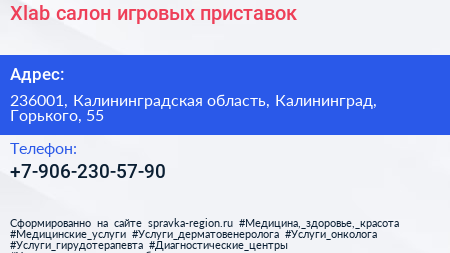 Xlab, салон игровых приставок по адресу 236001, Калининградская область, Калининград, Горького, 55 в дальнейшем Организация, размещена в следующих категориях: