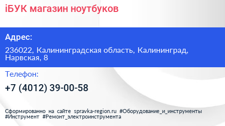 iБУК, магазин ноутбуков по адресу 236022, Калининградская область, Калининград, Нарвская, 8 в дальнейшем Организация, размещена в следующих категориях: