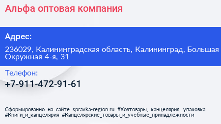Альфа, оптовая компания по адресу 236029, Калининградская область, Калининград, Большая Окружная 4-я, 31 в дальнейшем Организация, размещена в следующих категориях: