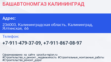 БАШАВТОНОМГАЗ-КАЛИНИНГРАД по адресу 236003, Калининградская область, Калининград, Ялтинская, 66 в дальнейшем Организация, размещена в следующих категориях: