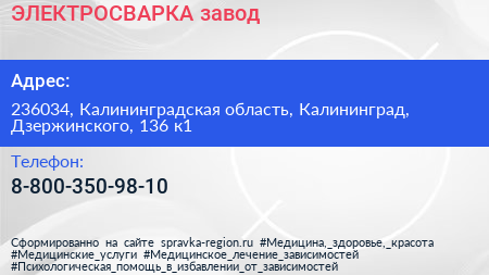 ЭЛЕКТРОСВАРКА, завод по адресу 236034, Калининградская область, Калининград, Дзержинского, 136 к1 в дальнейшем Организация, размещена в следующих категориях: