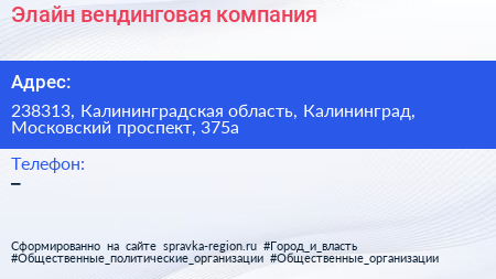 Элайн, вендинговая компания по адресу 238313, Калининградская область, Калининград, Московский проспект, 375а в дальнейшем Организация, размещена в следующих категориях: