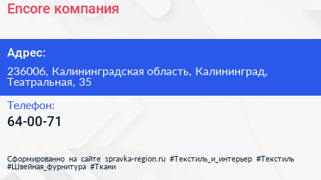 Encore, компания по адресу 236006, Калининградская область, Калининград, Театральная, 35 в дальнейшем Организация, размещена в следующих категориях: