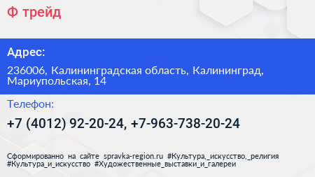 Ф-трейд по адресу 236006, Калининградская область, Калининград, Мариупольская, 14 в дальнейшем Организация, размещена в следующих категориях: