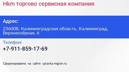 Hkm, торгово-сервисная компания по адресу 236008, Калининградская область, Калининград, Верхнеозёрная, 6 в дальнейшем Организация, размещена в следующих категориях: