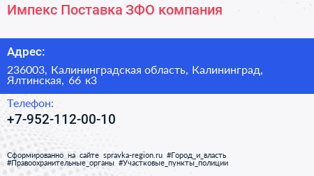 Импекс Поставка ЗФО, компания по адресу 236003, Калининградская область, Калининград, Ялтинская, 66 к3 в дальнейшем Организация, размещена в следующих категориях: