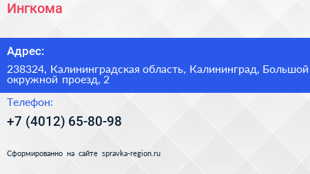 Ингкома по адресу 238324, Калининградская область, Калининград, Большой окружной проезд, 2 в дальнейшем Организация, размещена в следующих категориях: