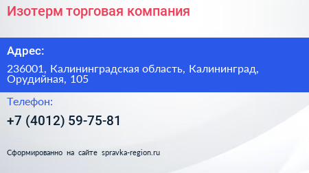 Изотерм, торговая компания по адресу 236001, Калининградская область, Калининград, Орудийная, 105 в дальнейшем Организация, размещена в следующих категориях: