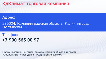 КдКлимат, торговая компания по адресу 236004, Калининградская область, Калининград, Полтавская, 5 в дальнейшем Организация, размещена в следующих категориях: