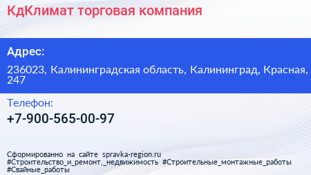 КдКлимат, торговая компания по адресу 236023, Калининградская область, Калининград, Красная, 247 в дальнейшем Организация, размещена в следующих категориях: