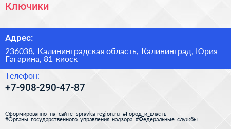 Ключики по адресу 236038, Калининградская область, Калининград, Юрия Гагарина, 81 киоск в дальнейшем Организация, размещена в следующих категориях: